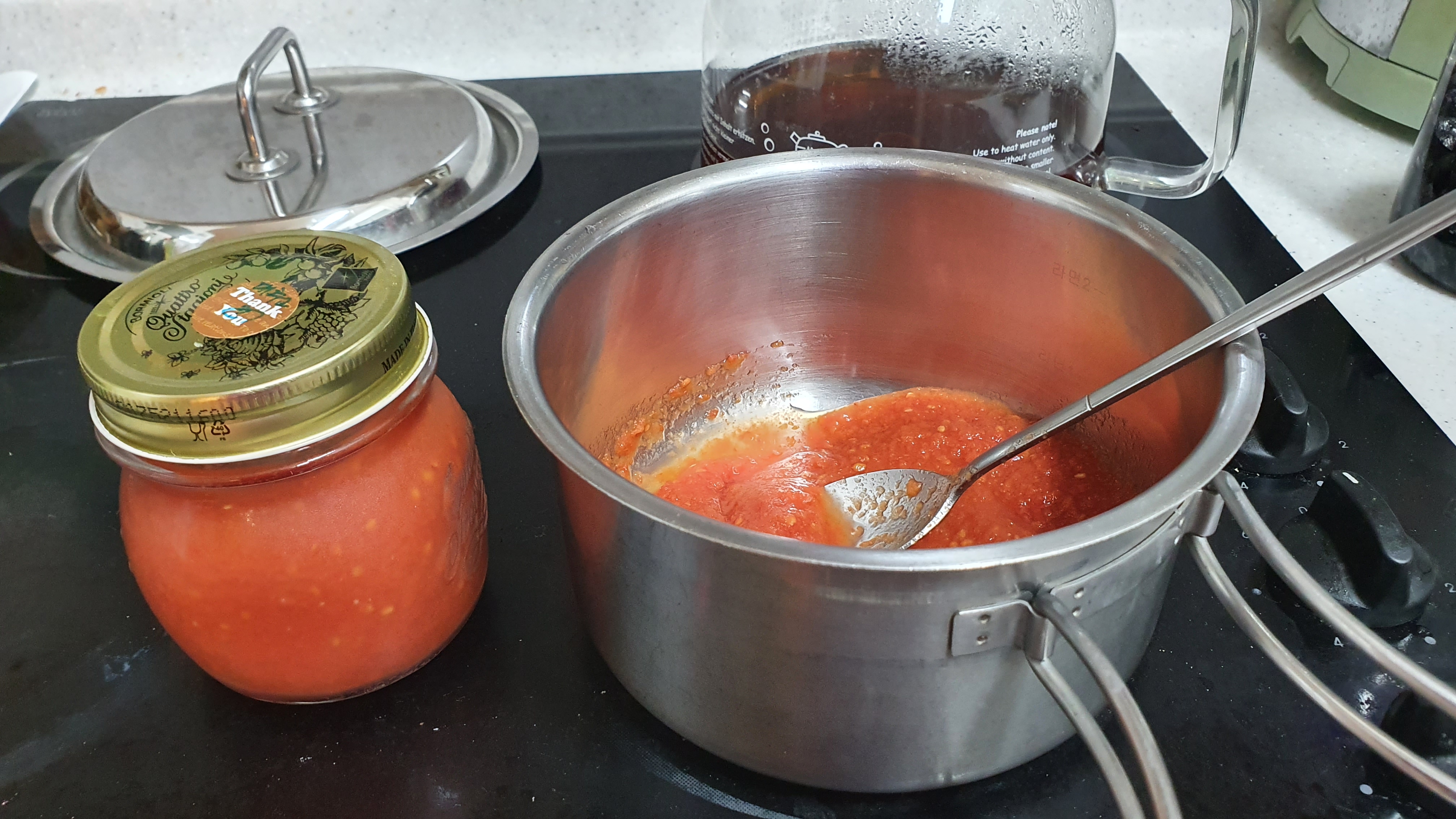 토마토를 잘라 블렌더에 갈고 한시간을 끓여 조린 걸 일부 데움ㅡ일인분(100g)에 넓은 국자같은 큰 수저로 3번 얹을 요량